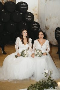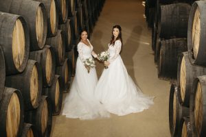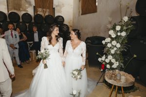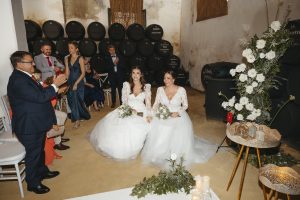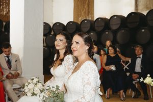 A continuación, la ceremonia civil se celebró en la Bodega Álvaro Domecq, un entorno con historia, carácter y personalidad propia. Sin duda, se trata de un lugar ideal para aquellas parejas que buscan una boda diferente en Jerez. Rodeadas de barricas y envueltas en un ambiente único, Irene y Marina se dieron el “sí, quiero” en una ceremonia íntima que, además, estuvo cargada de emoción.